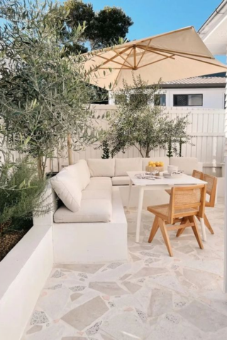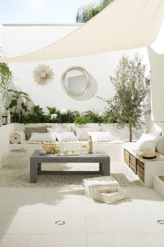 Pour créer une terrasse cosy vous pouvez associer les nuances claires et les matières douces tout en vous abritant des regards indiscrets. Banquettes moelleuses, coussins, plaids et style épuré s’allient pour votre plus grand bonheur.