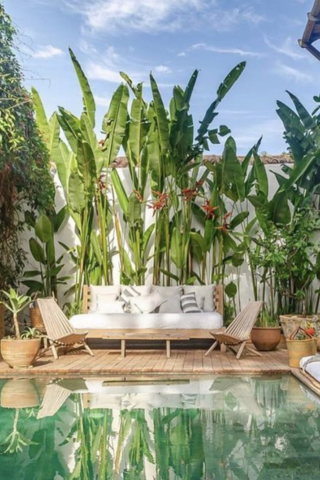 Couleurs acidulées, plantes XXL, motifs exotiques… la décoration tropicale est toujours aussi tendance. Si vous disposez de la surface, vous pourrez envisager d’ajouter une piscine hors-sol ou enterrée.