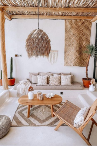 Tapis, fauteuils en rotin, poufs tressés… la déco bohème est parfaitement adaptée à l’extérieur. Vous pouvez adopter une touche de couleur comme le terracotta pour contraster avec les nuances claires. Les accessoires de préférence chinés (vases, fleurs séchées..) seront à ajouter pour personnaliser votre extérieur.