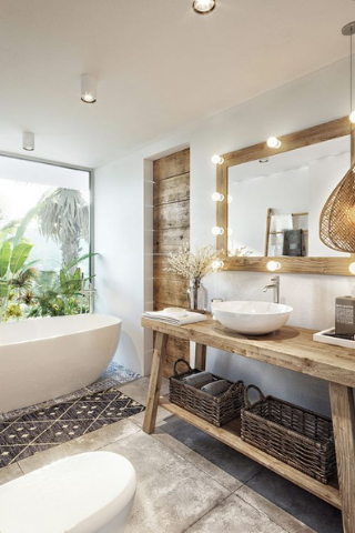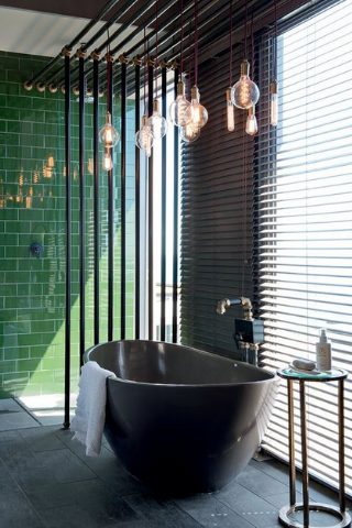 Pour créer une ambiance apaisante, l’éclairage est très important. L’idéal est d’opter pour différents luminaires : un éclairage fonctionnel blanc semblable à la lumière du jour au niveau du miroir et des éclairages tamisés à intensité réglable selon les envies.
