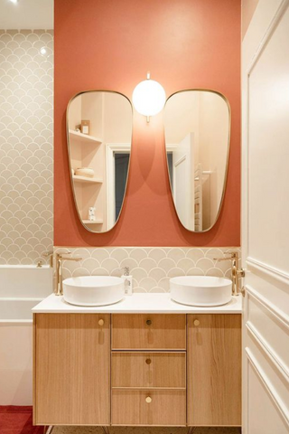 Le laiton est le matériau idéal pour une salle d’eau élégante et raffinée. Vous pouvez l’utiliser par petites touches, il illuminera subtilement la pièce. Très tendances, les miroirs doubles s’installent au-dessus de chaque vasque afin de parfaire votre décoration.