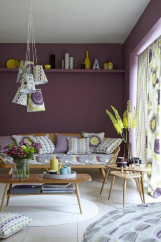 Couleur riche et élégante, le violet sort de l’ombre et ravive votre salon. Associé à des petites touches de couleurs chaudes (jaune ou orange), il sublime et illumine un intérieur bohème ou classique.