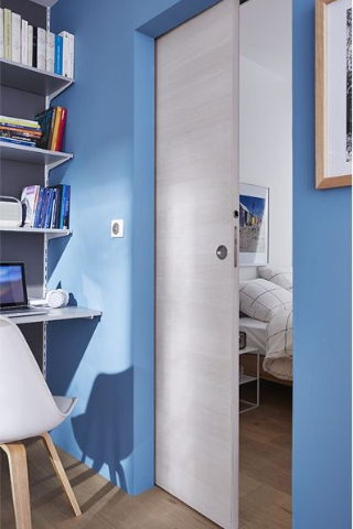 La porte à galandage se camoufle lorsqu’elle est ouverte dans la cloison murale. C’est une idée intéressante pour gagner de l’espace dans votre intérieur.