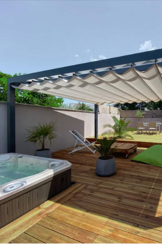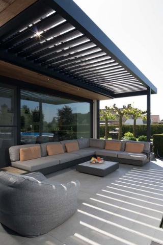La pergola bioclimatique permet d’orienter les lames et de modifier l’éclairage grâce à une télécommande. Elle s’adapte parfaitement au climat pour un confort optimal.