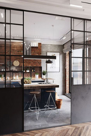 Pour un esprit loft industriel, la verrière atelier est tout à fait adaptée: du sol au plafond, elle propose deux portes coulissantes, pour un accès facilité et une importante luminosité.