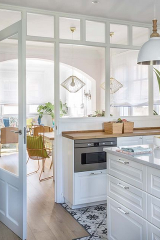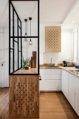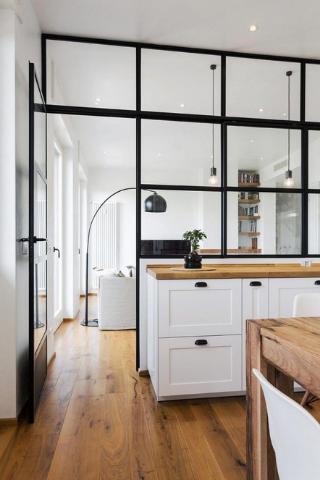 Si votre cuisine est située à proximité d’un couloir, installer une verrière permettra de fermer l’accès et limiter les odeurs tout en illuminant votre couloir. Une option déco réussie pour un intérieur moderne.