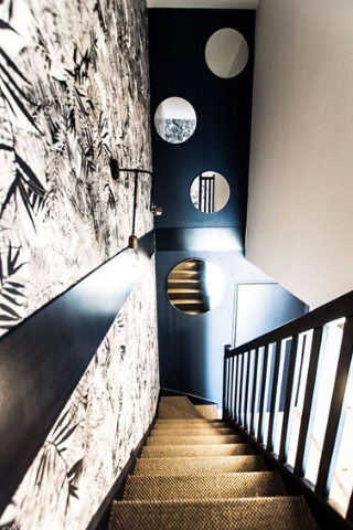 Pour révéler la splendeur de votre intérieur, vous pourrez aussi adopter un papier peint graphique dans la remontée d’escalier.