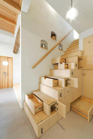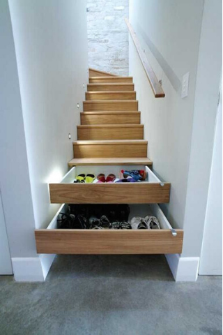 L’escalier peut aussi disposer d’espaces de rangement coulissant sur les côtés latéraux. C’est une astuce intéressante pour ne pas perdre l’espace souvent inutilisé sous l’escalier.