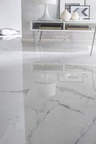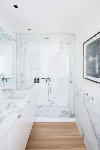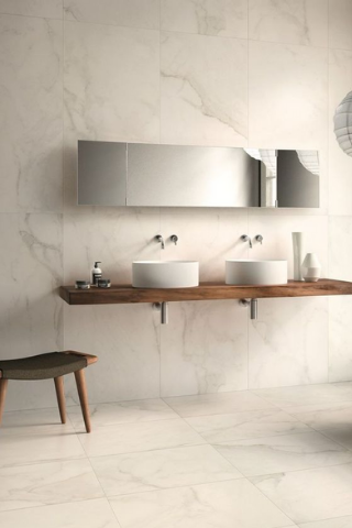On peut ainsi revêtir entièrement la salle de bain avec un carrelage en céramique effet marbre blanc pour un rendu original et authentique.