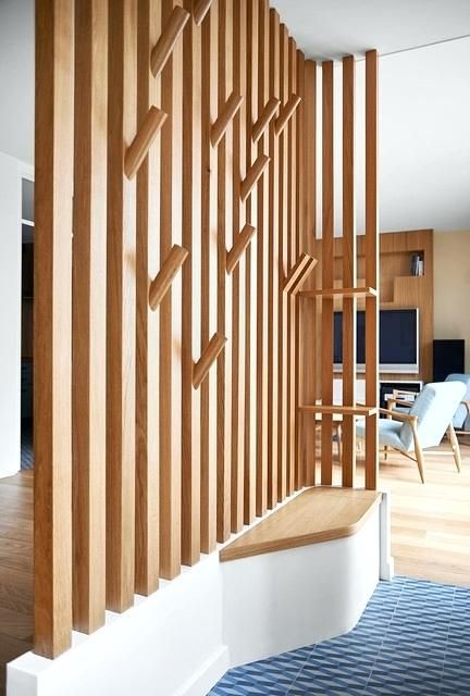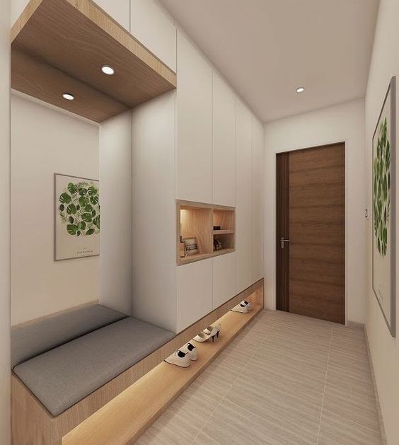 En accessoirisant l’entrée avec des étagères en bois posés dans les niches du mur, vous transformer votre entrée est un espace à la fois esthétique et pratique. Il est aussi possible de créer une banquette personnalisée qui imite les tournures du mur. Une fois de plus, la continuité de couleur fait toute la différence.