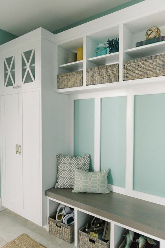 Recouvrez entièrement le mur de l’entrée avec un meuble qui arbore une couleur vivante. Ajoutez-y des plantes et vous obtenez un mini jardin d’intérieur qui donne vie à l’espace. En plus, vous avez de nombreux rangements pour stocker divers objets