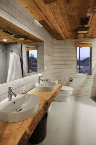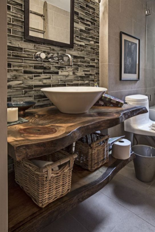 Le mobilier en bois est très fréquent et reste un intemporel dans la salle de bain, vous pouvez pousser la tendance en optant pour du bois brut.