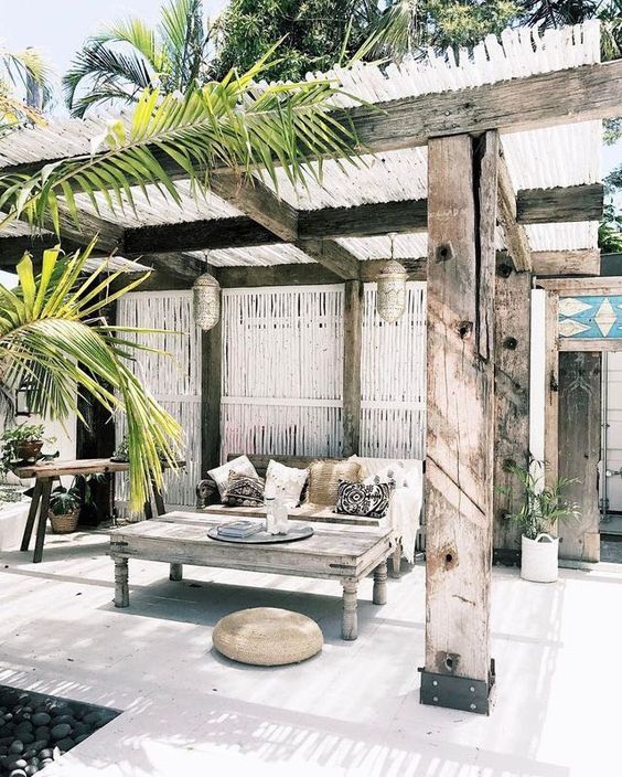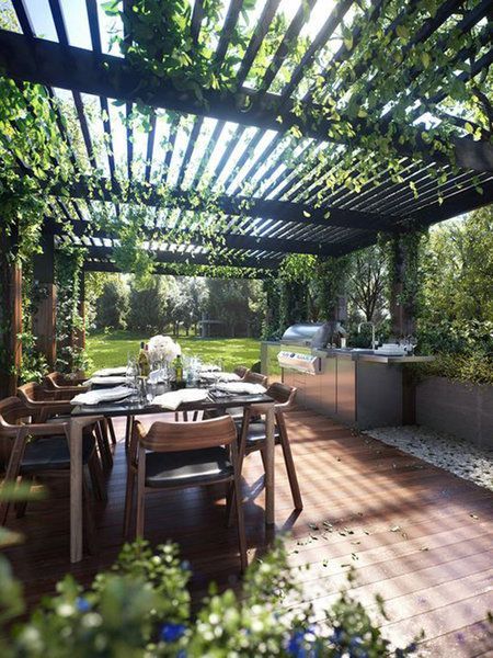 Pour apporter des touches végétales à cette pergola, laissez pendre des plantes grimpantes comme la glycine, le chèvrefeuille ou la vigne. En plus de répandre de bonnes odeurs, vous profitez de la fraicheur apporter par ces dernières.