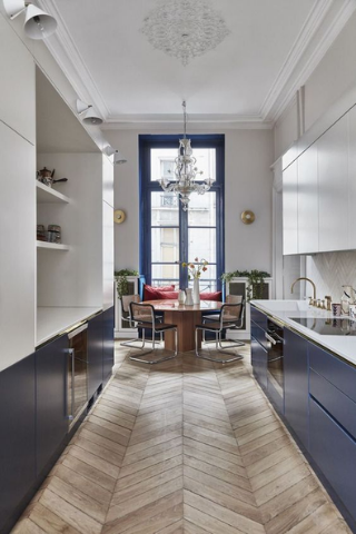 Cette année, la cuisine bicolore se place en première ligne pour une pièce avec davantage de caractère. En effet, elle offre une continuité de style entre vos différents espaces. Par exemple, vous pouvez associer une nuance lumineuse avec une teinte foncée comme le bleu nuit et le blanc.