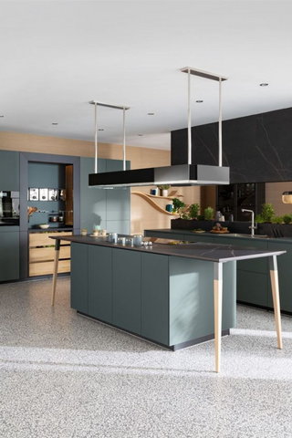 La hotte devient un élément de décoration à part entière. Très design, il s’agit soit de la dissimuler à l’intérieur des étagères ou au contraire de la révéler davantage en la disposant au-dessus de l’îlot central.