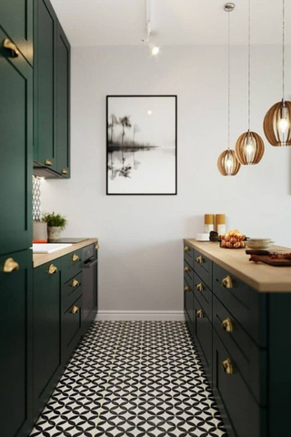 Le vert forêt arrive dans votre cuisine. Il s’allie merveilleusement avec un carrelage plutôt vintage et les poignées en laiton.