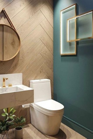 Le bois, matériau naturel par excellence, apporte beaucoup de cachet à votre intérieur. Pour des toilettes chics et colorées, pensez à inclure une touche de couleur sur une autre partie du mur. Dans des toilettes disposant d’une belle surface, vous pouvez ajouter un lavabo et pour embellir votre déco un miroir.