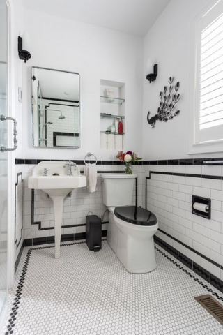 Très tendances, ces couleurs s’adaptent à tous les styles. Vous pouvez opter pour du carrelage blanc avec des frises noires et changer la couleur de vos accessoires : remplacée votre cuvette colorée, votre poubelle…