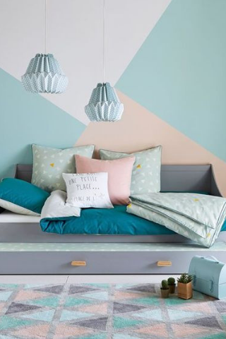 Pour votre chambre, vous pouvez aussi utiliser du papier peint ou de la peinture afin de réaliser une décoration graphique. L’harmonie des couleurs sera la clé.