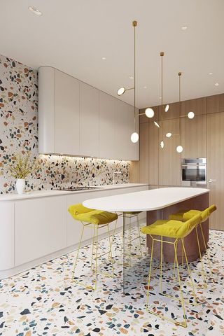 Pour son sol, un carrelage en terrazzo sera idéal pour une pièce plus accueillante et lumineuse. Quel que soit l’élément de décoration, utilisez-le de façon homogène et équilibré.
