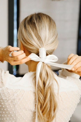 Rouge, noir, fuchsia, blanc... les rubans ont le vent en poupe. Ils conviendront parfaitement pour sublimer une queue-de-cheval, un sleek bun ou cacher une barrette. Vous pouvez les acheter tout fait ou créer un nœud avec un ruban de votre choix.