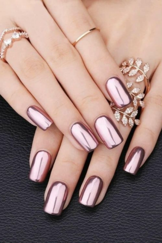 C'est la tendance du moment! Les ongles se parent de vernis effet métal argenté, doré, rose, vert ou bleu. Vous pourrez la porter sur des ongles courts ou longs.