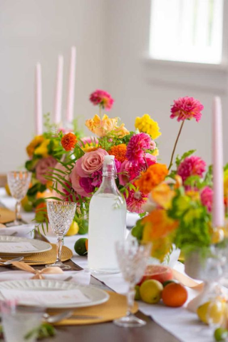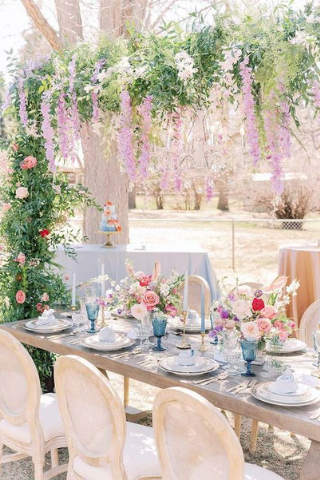 Si vous souhaitez un style plus discret, vous pouvez choisir les couleurs douces (nude, rose poudré) et les associer avec des nuances plus vives comme le bleu et le mauve. Pour parfaire votre table, pensez à ajouter plusieurs branches naturelles.