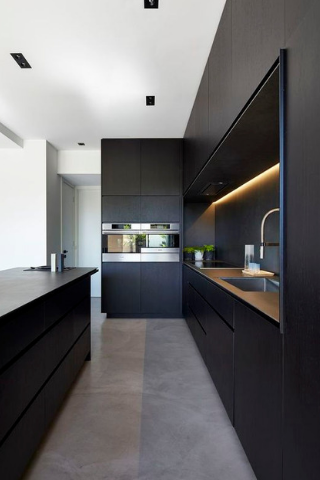 Pour un style contemporain, vous pouvez opter pour un total look noir, grâce à des meubles noir uni qui se marient parfaitement avec le bois. Pour plus de luminosité, il est judicieux de laisser les murs blancs.