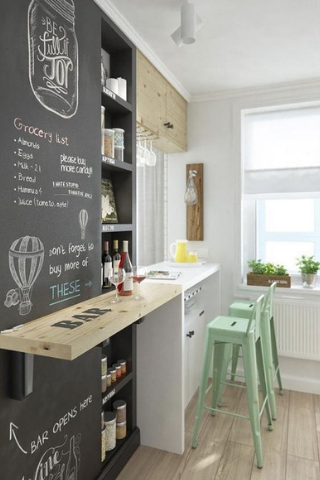 Un mur complètement noir dans votre cuisine peut faire la différence pour une décoration très tendance. Il existe des peintures noires ardoises permettant d’écrire à la craie, ce qui peut être parfait pour noter des recettes ou les commissions.