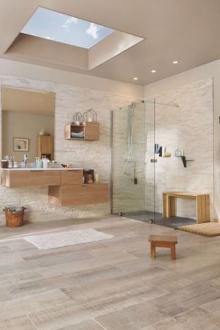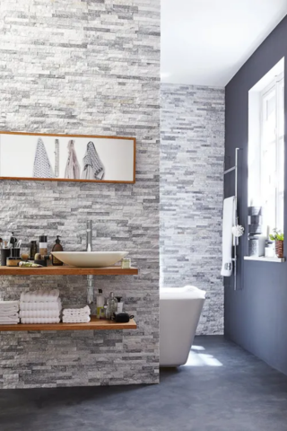 Dans votre salle d’eau, vous pouvez opter pour la pierre de parement. Pour une pièce particulièrement lumineuse, il est important de privilégier les nuances claires. Pensez à ajouter un puits de lumière ou un velux pour apporter davantage de lumière naturelle à votre pièce.
