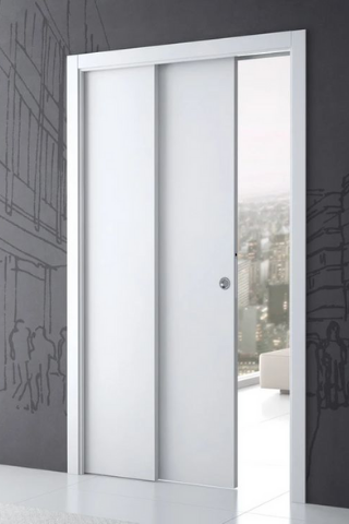 Celle-ci permet de loger deux portes coulissantes dans un seul coffre. Elle est idéale lorsque l’ouverture est très large et que la longueur du mur est restreinte.