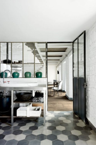 Évoquant les tomettes anciennes, le carrelage industriel hexagonal s’invite sur le sol et les murs. Il permet également une belle créativité puisque vous pouvez l’associer avec du carrelage effet parquet.