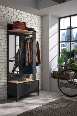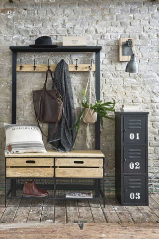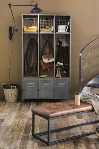 Pour parfaire la déco de votre entrée, optez pour des accessoires comme un miroir, une lampe et des casiers en métal, un coussin vintage… Osez mélanger le bois brut avec le métal et la pierre, c’est l’ADN du style industriel.