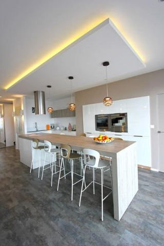Dans la cuisine, n’hésitez pas à jouer avec les volumes ou poser un plafond suspendu désolidarisé et retenu grâce à des suspentes, pour un style très moderne.
