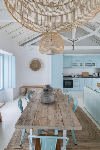 L’enjeu de la déco campagne chic est de transformer un intérieur plutôt neutre en lui apportant chaleur et convivialité. On opte pour le bois massif et les suspensions en rotin pour réchauffer l'atmosphère.