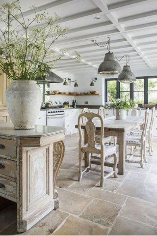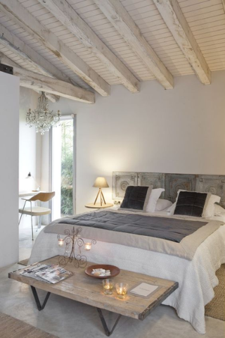 Les tommettes en ciment et les accessoires métalliques (coffres, tables, chaises...) s’initient dans votre décoration. Les poutres apparentes en bois brut ou peintes en blanc sont très caractéristiques de ce style.