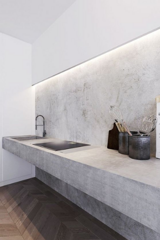 Très prisé, le béton ciré s'adapte partout, au sol comme aux murs, et même sur le plan de travail de la cuisine ou dans la salle de bain.