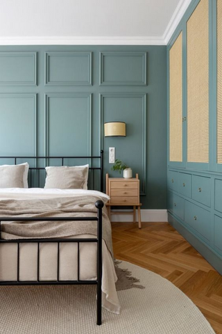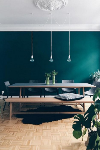 Revêtement mural indémodable, la peinture se réinvente en permanence et personnalise à merveille votre intérieur. Peindre un pan de mur dans une teinte plus foncée comme le bleu canard permet de bien structurer l’espace.