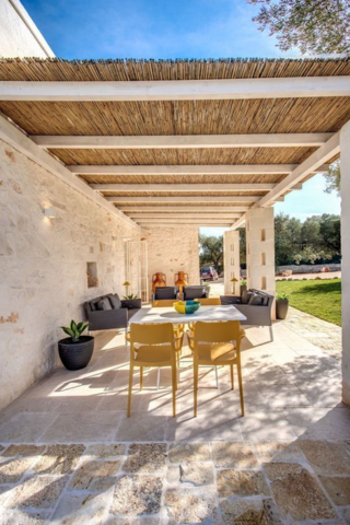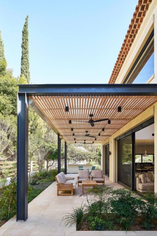 Pour une terrasse plus chaleureuse, pensez à choisir une pergola avec un revêtement en canisse.