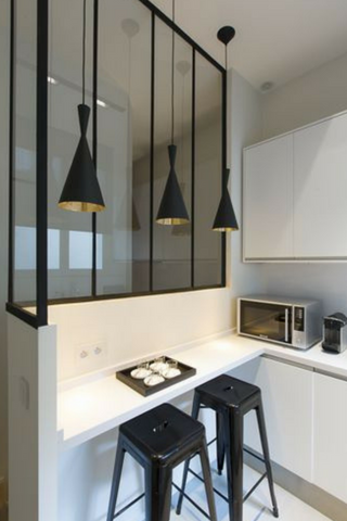 Dans les petits espaces, une verrière associée à un comptoir permet d’avoir un lieu idéal où se restaurer tout en séparant cette partie de l’espace salon.