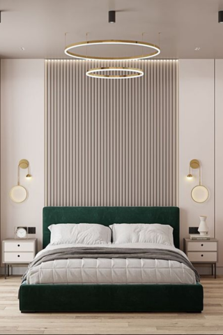 Si vous souhaitez une tête de lit originale et moderne, optez pour l’effet bois plissé. Pensez à ajouter des luminaires au plafond, sur les tables de chevet et les murs pour un espace lumineux de jour comme de nuit.