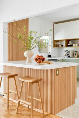 Îlot central, murs, meubles… l’effet bois plissé arrive dans votre cuisine. C’est votre allié pour ajouter du cachet à votre pièce.