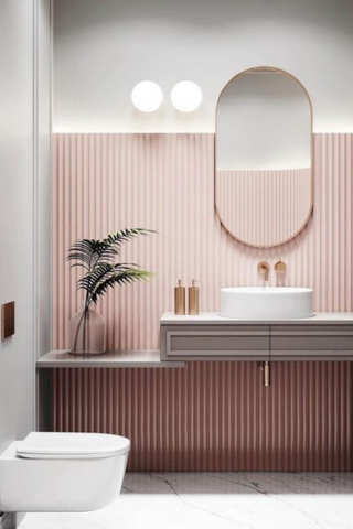 Dans la salle de bain, vous pouvez le peindre en rose pour une déco originale et douce. Vous pouvez l'associer à des matériaux comme le bois pour davantage d'authenticité.
