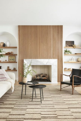 Au cœur du salon, à proximité de la cheminée, l’effet bois plissé offre un intérieur chaleureux. Pour optimiser l’espace, pensez à créer des alcôves avec des rangements.