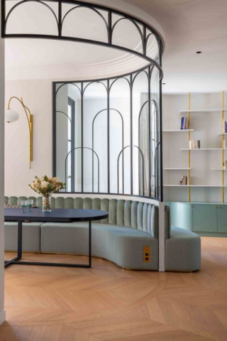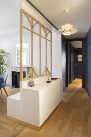 Pour délimiter le couloir et le salon, la verrière est votre alliée. Ses formes arrondies et son cadre doré vous invitent au cœur du style art déco.