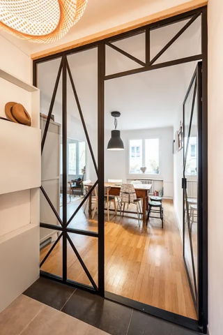 Afin de séparer l’entrée de la salle à manger, cette verrière en métal est à mi-chemin entre le style moderne et industriel. Ses formes géométriques viennent parfaire la déco intérieure.